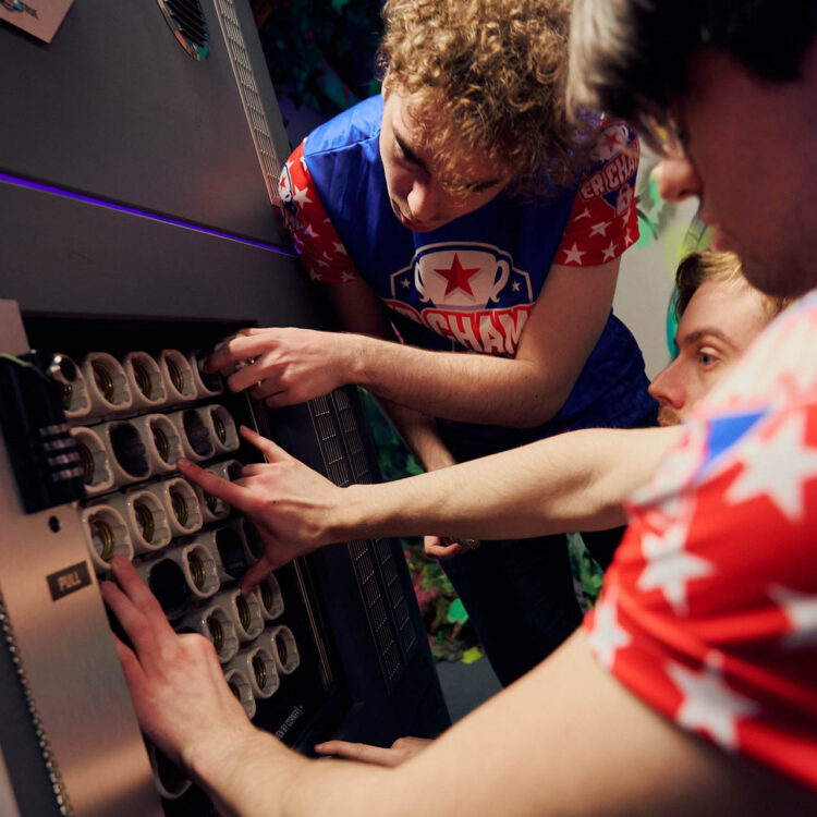 Realizacja wymagała pełnej adaptacji przestrzeni: dołożyliśmy profesjonalne oświetlenie, wykonaliśmy otwory w ścianach pod trasy kablowe, a całość wizualnie dopełniła klimatyczna scenografia, która zbudowała unikalną atmosferę rozgrywek.